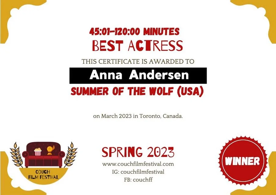Anna won the Best Actress Award for her role in Furiex Film’s latest feature, ‘Summer of the Wolf’ at this year’s Spring ‘Couch Film Festival’ in Toronto.